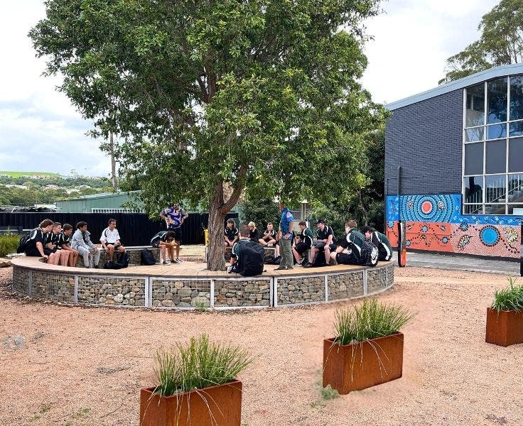 Opened in 2023, our Yarning Circle is a special gathering place that celebrates culture, connection, and community. The space was designed by a former Oak Flats High School student as their Year 12 major project, and brought to life with a striking mural by Uncle Richard Campbell. Today, it provides a meaningful setting for outdoor learning, reflection, storytelling, and coming together as a school community.