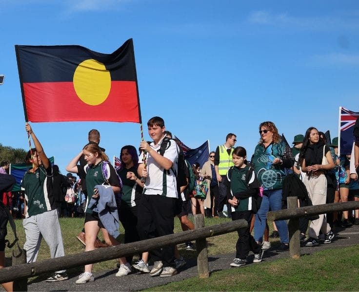 Each year in Term 2, Oak Flats High School takes part in the Shellharbour Reconciliation Flag Walk, proudly walking alongside Elders, schools, and community members in the spirit of reconciliation. Our students carry the Aboriginal Flag high and join in ceremonies and performances that honour culture and strengthen community connections. Back at school, we continue the celebrations with a whole-school Reconciliation Assembly, where students and staff come together to reflect, learn, and celebrate the importance of reconciliation. These events are a meaningful highlight of the year, reminding us of the strength of culture, respect, and unity.
